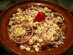 slowly cooked chunks of tender chicken breast in a classic red sauce, serve with rice, refried beans & tortillas