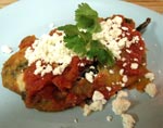 classic dish with fresh grilled poblano peppers stuffed with montery jack cheese, baked in oven and topped with red sauce, feta cheese & cilantro